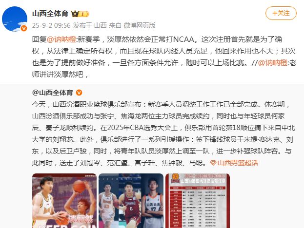 尽管此前山西男篮完成对于淡厚然的注册,但更多是为了确定所有权。根据媒体人山西全体育透露:“新赛季淡厚然依然会正常打NCAA。这次注册首先就是为了确权,从法律上确定所有权,而且现在球队内线人员充足,他回来作用也不大。其次也是为了提前做好准备,一旦各方面条件允许,随时可以上场比赛。”