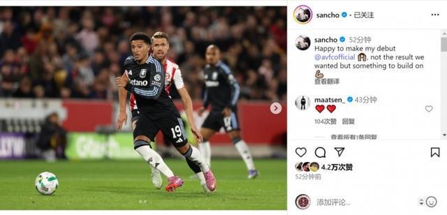 桑乔社媒晒出比赛照片,并写道:“很高兴上演维拉首秀,虽然结果不是我们想要的,但这是可以继续努力的基础。”