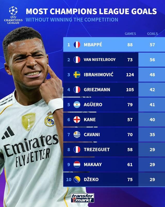 赛后来自德转的统计指出,本场比赛完成梅开二度的姆巴佩已经将自己生涯的欧冠进球数提升到了57球,他也就此超越了曼联和皇马旧将范尼斯特鲁伊,成为从未赢得欧冠冠军进球数最多的球员。