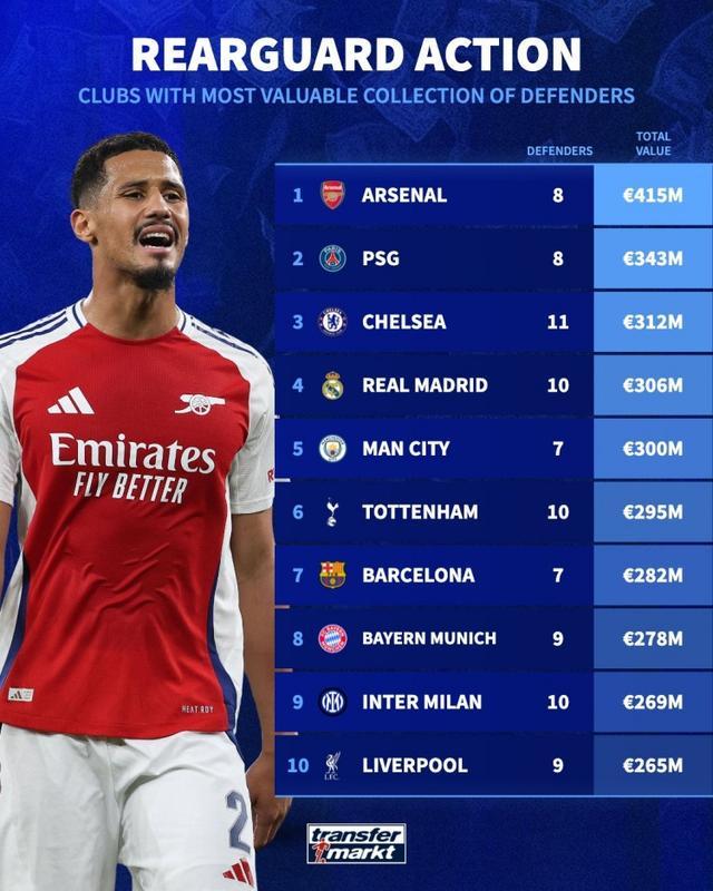 直播吧9月24日宣 德国转会市场统计了各队阵容中后卫球员的总身价,并列出榜单,阿森纳4.15亿欧居首,巴黎、切尔西二三位。