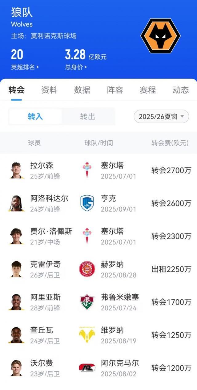 引援方面,狼队也花费近1亿欧元引进了拉尔森(买断)、阿洛科达尔、费尔·洛佩斯等多名球员。