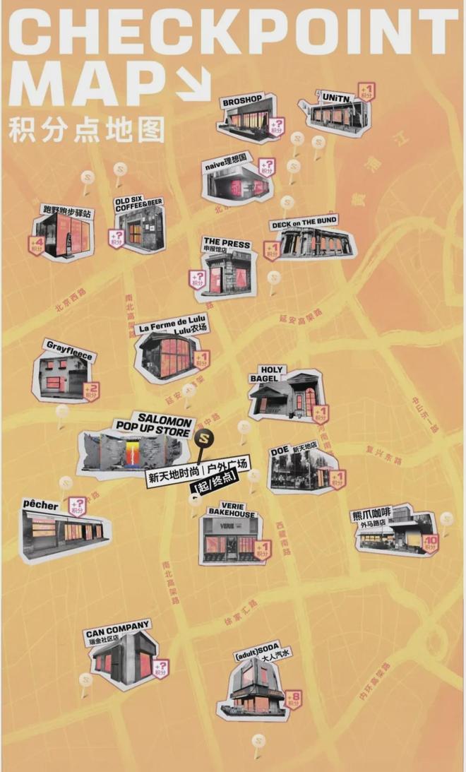 按照萨洛蒙官方信息显示,赛事起终点设置在新天地户外广场,但赛道路径并没有作具体规定。参赛选手需要根据在上海黄浦区分别设立的16个充满先锋调性的积分点,合理分配自己的行进路线,赚取足够积分,并在两小时内成功返回。