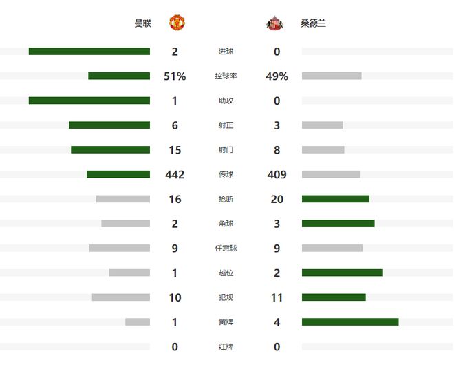 第26分钟B费大禁区前沿原地摆腿兜射,可惜运气不佳,皮球击中横梁被弹出,不过5分钟之后,曼联就扩大了领先优势,达洛特大力手抛球,造成桑德兰禁区一片混乱,舍什科门前抢点建功,将比分改写为了2-0,半场结束前,舍什科本方禁区防守时抬脚过高,踢到了进攻球员,但主裁回看VAR后并没有吹罚点球。