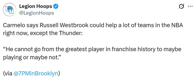 谈及威少的潜在去向时,安东尼认为他依然可以帮到现在的很多球队,除了雷霆。“他可是这支球队(雷霆)队史最伟大的球员,不能沦落到‘可能能上场、也可能打不上’的境地。除非他说‘普雷斯蒂(雷霆总经理),我想在雷霆退役,这是我最后一年,我们一起办个退役仪式’,但要是回去坐冷板凳,绝对不行。”
