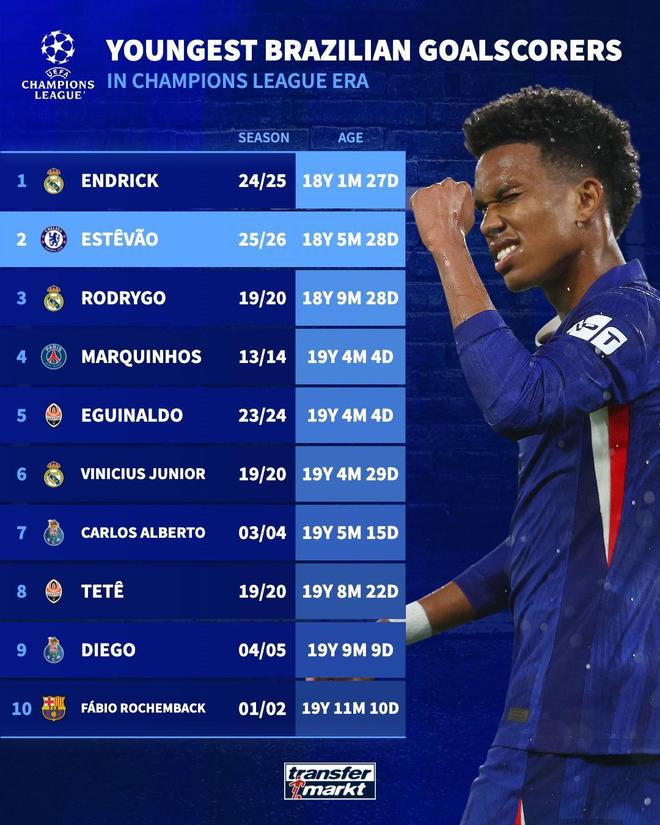 在与阿贾克斯的比赛中斩获欧冠生涯处子球后,18岁的埃斯特旺成为切尔西队史欧冠最年轻进球者,他也是欧冠进球第二年轻的巴西球员,仅次于恩德里克。