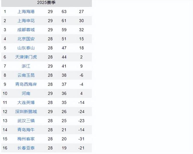 上海海港、上海申花均在本轮取胜,成都蓉城1-2负于河南,积分榜上,成都蓉城59分提前1轮退出争冠,上海海港63分、上海申花61分最后一轮争冠,但是在上海海港握有2分的优势下,他们下轮只要打平就可以夺冠。