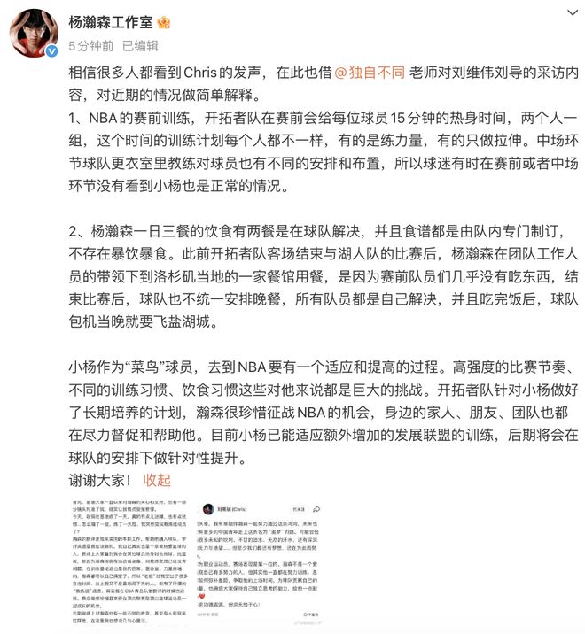 11月5日,据白鹿视频报道,@杨瀚森工作室发文回应杨瀚森近期争议。