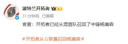 5日中午,开拓者官方宣布,球队从发展联盟召回杨瀚森。