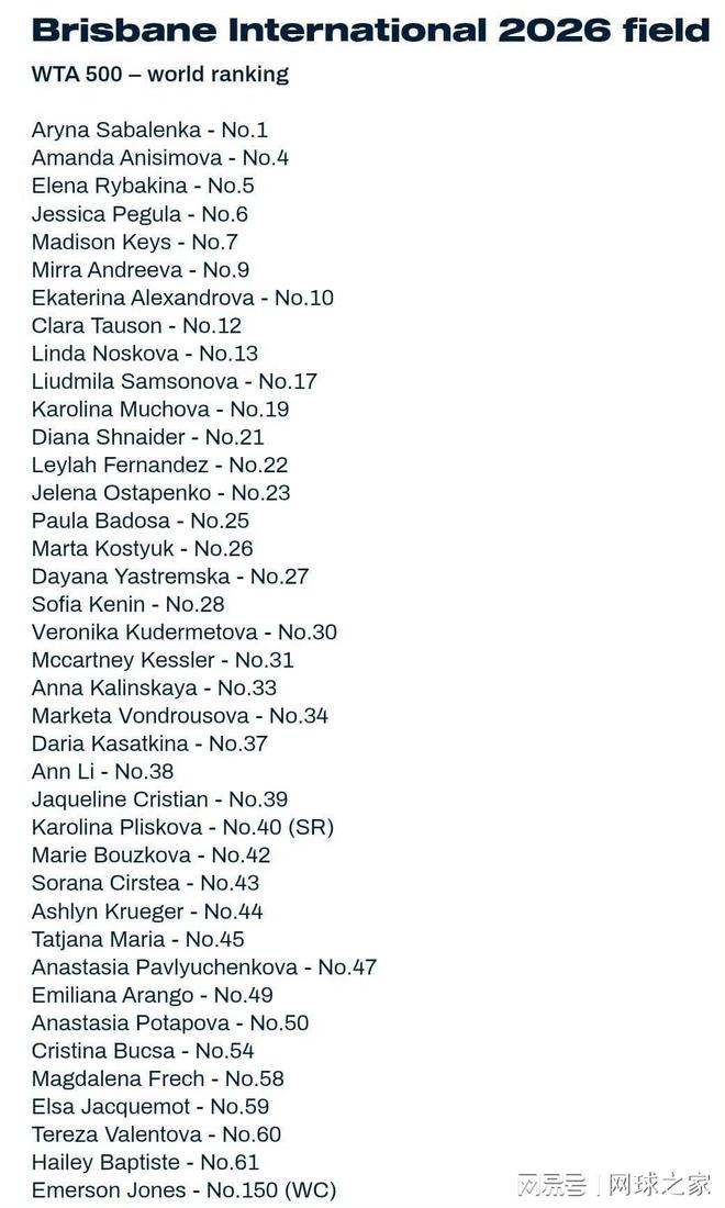 两相比较,占据地理优势的布里斯班的参赛阵容要更为豪华一些。在这站男女单都有的赛事中,女单由卫冕冠军萨巴伦卡领衔。此外,还有阿尼西莫娃、莱巴金娜、佩古拉、凯斯、安德列娃、亚历山大洛娃六位TOP10选手,届时三届赛会冠军卡-普利斯科娃也将亮相。