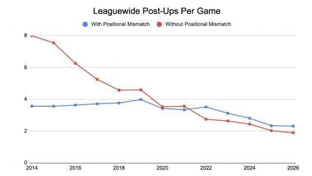 随着数据分析在NBA扎根,低位背打的数据也有所改善,因为球队正在寻找更好的情境来调用这种战术。当今多才多艺的大个子和快节奏、拉开空间的风格,使得低位背打模式比前几十年更具效率。