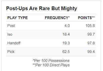 本赛季,这个差距甚至更大:包含低位背打的进攻每100回合得103.9分,而整体半场进攻每100回合得99.0分,相差4.9分。