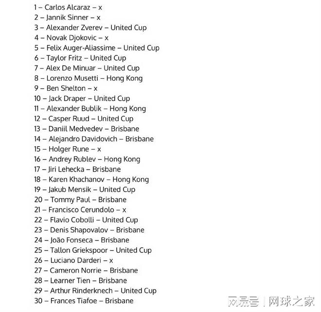 联合杯作为一项为国争光的赛事,也吸引了不少球员前往,包括美国一哥弗里茨、德国一哥兹维列夫、加拿大一哥阿利亚西姆、挪威一哥鲁德、意大利三哥科波利、澳洲一哥德米纳尔、捷克一哥门西克以及荷兰一哥格里科斯普尔。